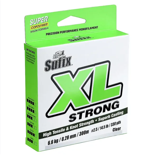 XL Strong pode ser a linha de monofilamento mais versátil do Sufix. Tem algumas qualidades muito boas, como alta resistência ao nó, baixa memória de linha e longo alcance. A linha é muito forte e funciona para quase todas as técnicas de pesca.