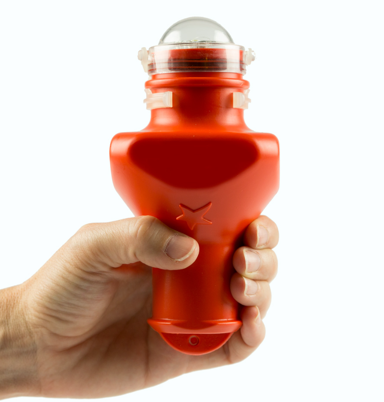 Possui um arco de visibilidade de 360° e emite uma luz branca intermitente de 60 flashes por minuto com uma duração aproximada de 8 horas. É alimentado por uma única pilha alcalina tipo R-20 de tamanho padrão não incluída com o dispositivo.